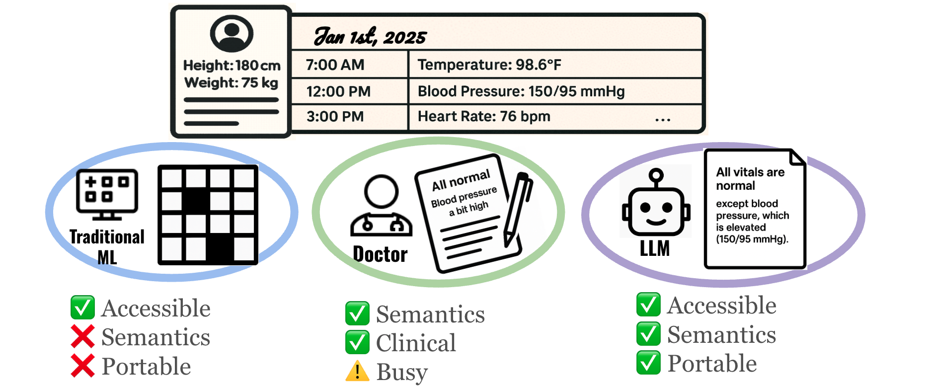 Figure 1. Motivation for Record2Vec. Traditional machine learning relies on numeric imputation grids that lose crucial clinical semantics and limit cross-site portability. On the other hand, while human doctors generate handoff notes that perfectly preserve clinical meaning, their time is scarce and documentation can be highly variable. LLMs occupy a sweet spot: they are accessible and can autonomously create handoff-style summaries that retain deep clinical semantics while providing standardized, highly portable inputs for downstream forecasting and classification models.