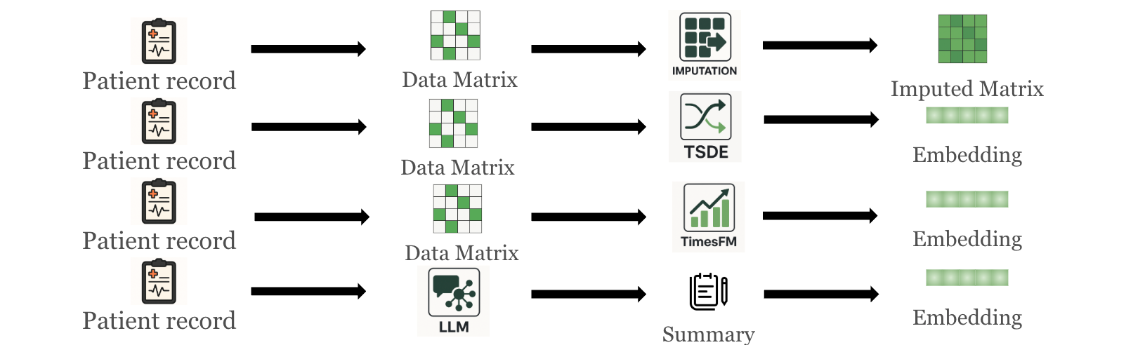 Figure 2. Methods to generate medical-record representations: imputation pipeline, self-supervised TS representation (TSDE), TS foundation model (TimesFM), and Record2Vec (LLM summary followed by text embedding).