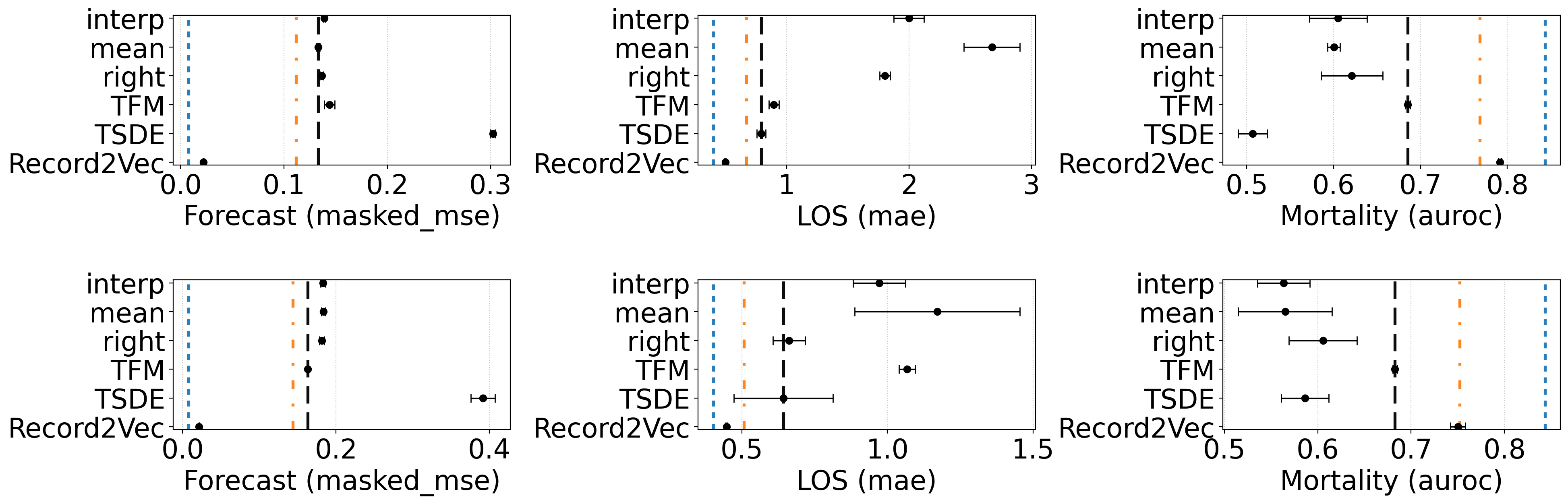 Figure 3. Few-shot finetuning with 16 labeled target samples for mortality prediction (RQ5) shown across six transfer settings. All tasks are reported the same metric as previous section: Forecast: masked mse, LOS: mae, Mortality: AUROC. The first row is the result of Hirid → Ppicu and the second row is Mimic → Ppicu. Reference lines: blue = best in-distribution upper bound, orange = best pre-finetune result, black = best finetuned baseline. Record2Vec surpassed baselines with a large gap, reaching comparable performance to in-distribution.