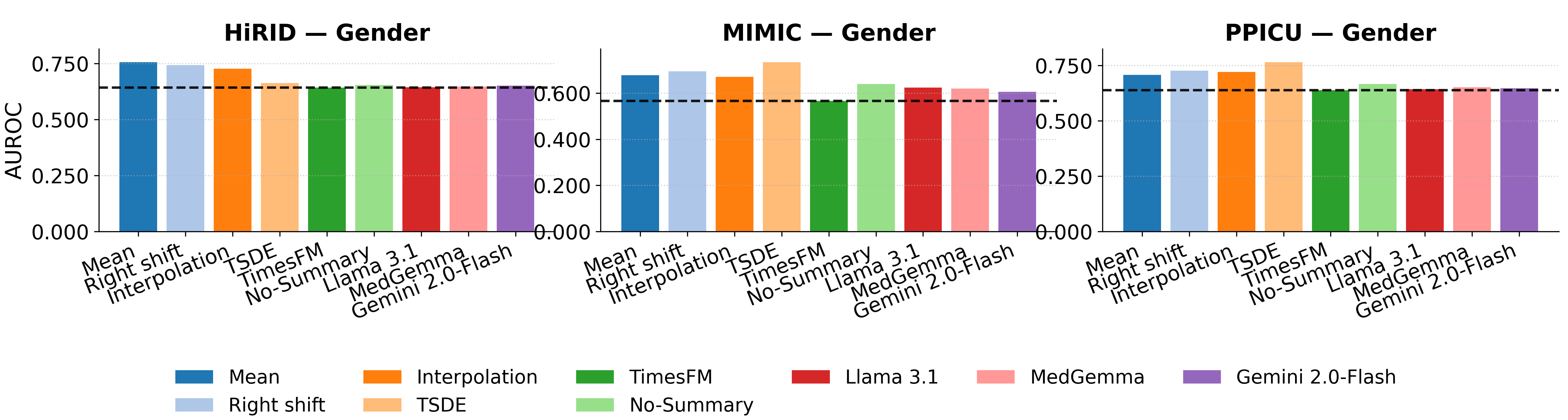 Figure 4. In-distribution privacy prediction on Gender across three ICU datasets. Record2Vec achieves comparable or reduced privacy leakage compared to traditional imputation baselines.