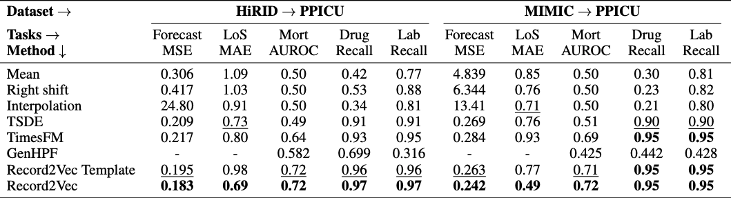 When evaluated across hospitals, grid imputations degrade sharply under shift, and several classification scores collapse toward chance. In contrast, Record2Vec heavily mitigates these performance drops, winning 10 out of 10 transfer columns (with two ties by TimesFM). By standardizing heterogeneous coding choices and sampling practices into a shared clinical language, Record2Vec strips site-specific artifacts and preserves signals crucial for mortality and treatment prediction.